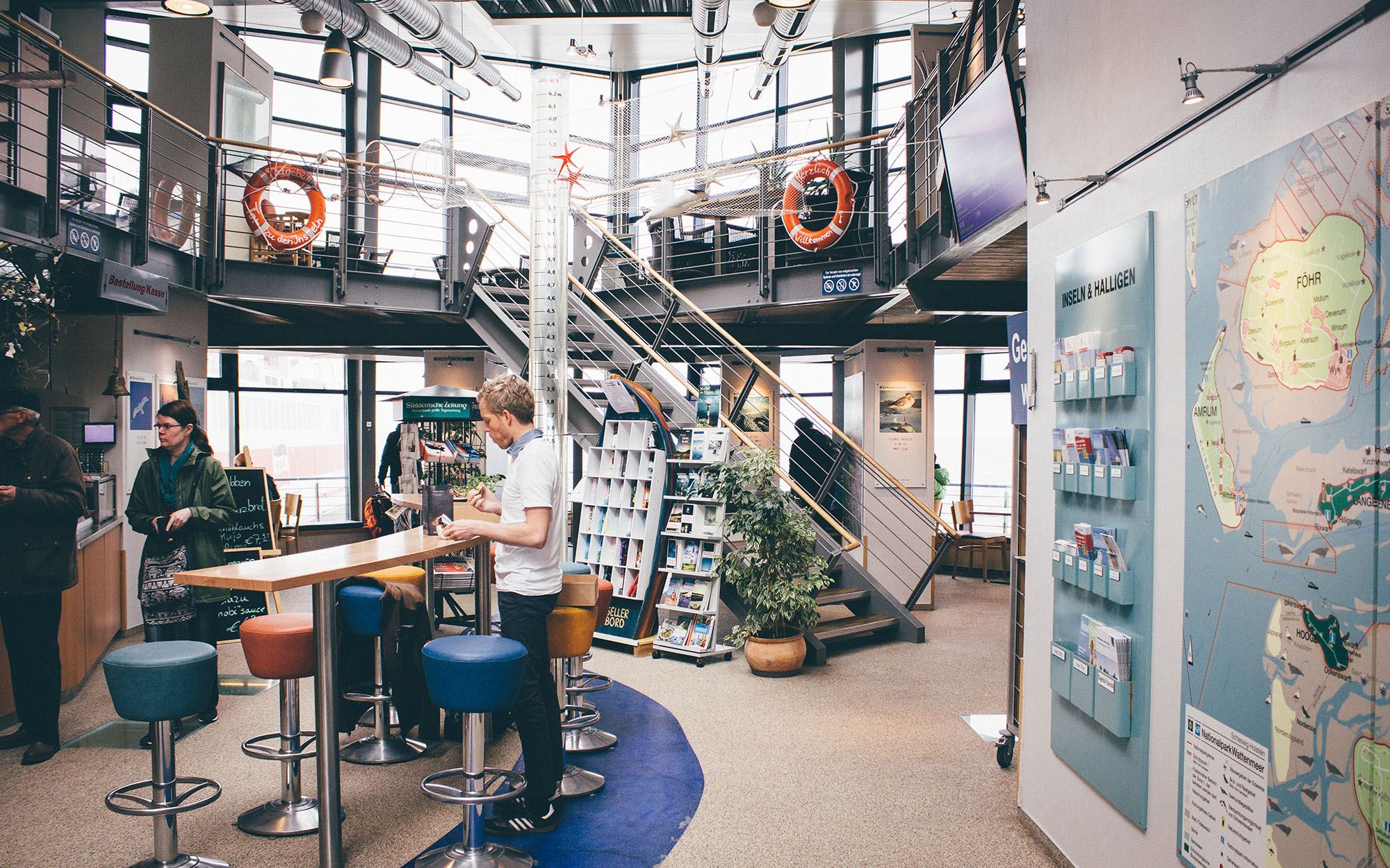 Oh dieser Duft, der so typisch für die Nordseeküste ist: eine frische Meeresbrise, das saftig-grüne Gras auf den Deichen, ein leckeres Krabbenbrötchen, der heiße Pharisäer, leckerer Kuchen... Moment mal, was weht denn da so verheißungsvoll um unsere Nasen? Schnell haben wir entdeckt, woher diese vielversprechenden Aromen kommen: aus dem modernen Servicegebäude zwischen den Fähranlegern. Denn hier liegt das Bistro „Tor zu den Inseln". Magisch angezogen steigen wir die Treppe nach oben und stellen fest: Ja, jetzt und hier beginnt unser Urlaub!